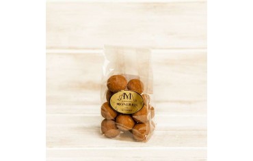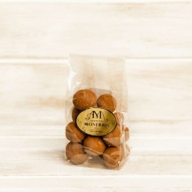 Ingredientes: Cobertura de chocolate blanco (azúcar, manteca de cacao, LECHE en polvo, emulgente: lecitina de SOJA) y NUEZ DE MACADAMIA, azúcar y cacao en polvo. NO CONTIENE GLUTEN.