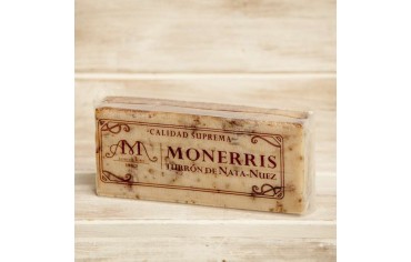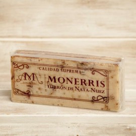 Ingredientes: ALMENDRA molida (35.8%) procedencia España, azúcar, nueces 7 %, NATA líquida 6 % (nata y estabilizante E407), LECHE en polvo entera, obleas (almidón de patata y aceite de girasol) y conservador ácido sórbico E200. PUEDE CONTENER TRAZAS DE HARINA DE TRIGO Y HUEVO. VALOR NUTRICIONAL EN 100 g: V. energético: 489 Kcal; Grasas: 29 g, de las cuales saturadas: 4,5 g; H. carbono: 44 g, de los cuales azúcares: 41 g; Proteinas: 11 g; Sal: 0,04 g CONSERVAR EN LUGAR FRESCO Y SECO