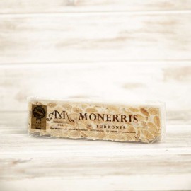INGREDIENTES: Almendra marcona 65 % origen España, miel de romero o azahar 19 % origen España, azúcar, obleas (fécula de patata y aceite de girasol) y clara de huevo. ELABORADO EN UNA FABRICA QUE UTILIZA CACAHUETE Y OTROS FRUTOS DE CÁSCARA, LECHE, SESAMO Y SOJA. NO CONTIENE GLUTEN. INFORMACION NUTRICIONAL: Valor energético: 553 Kcal; Grasas: 37 g, de las cuales saturadas: 3 g; H. carbono: 37 g, de los cuales azúcares: 36 g; Proteinas: 16 g, Sal: 0,01 g. CONSERVAR EN UN LUGAR FRESCO Y SECO